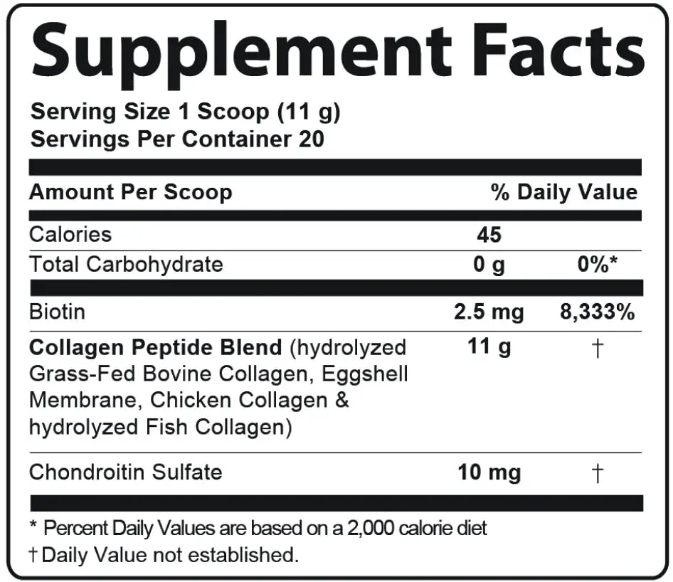 Colágeno e sulfato de condroitina são amplamente estudados para saúde das articulações. Pesquisas mostram que eles ajudam na reparação da cartilagem, mobilidade das articulações e força óssea. A biotina é comprovadamente eficaz para manter cabelo, unhas e pele saudáveis, complementando o bem-estar das articulações e ossos para um estilo de vida ativo.