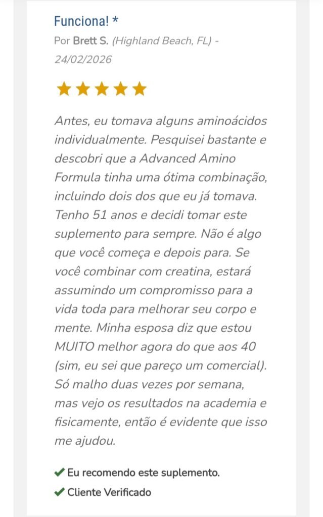 É aí que entra o Advanced Amino Formula. Ele funciona como um dos melhores suplementos para construir massa muscular, fornecendo ao seu corpo exatamente o que ele precisa para apoiar a força muscular sem rotinas complicadas. É chamado de um dos melhores suplementos porque milhares de pessoas já ficaram satisfeitas com ele.